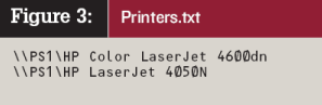 Для того чтобы добавить или удалить сразу несколько принтеров, можно создать текстовый файл, который содержит список принтеров, по одному принтеру в строке. На Рисунке 3 показан пример текстового файла Printers.txt со списком принтеров. Следующая команда добавляет принтеры, перечисленные в файле Printers.txt, на компьютер RECEPTION2: