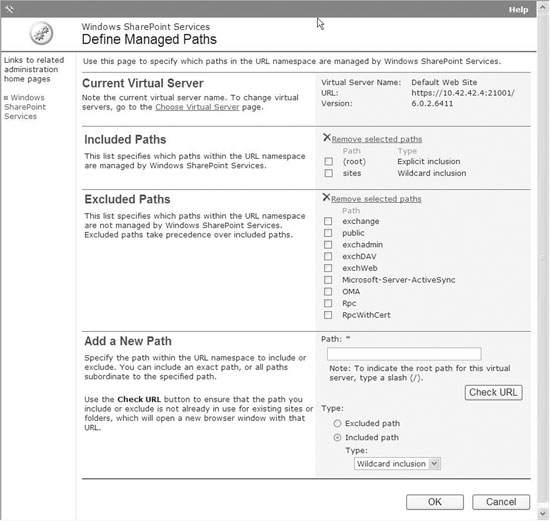 Еще одна проблема заключается в том, что по умолчанию как SharePoint, так и OWA устанавливаются в Web-узле, создаваемом IIS на системе. Фильтр ISAPI (stsflt.dll) программы SharePoint перехватывает все входящие запросы, поэтому пользователи получают сообщение об ошибке 404 Page Not Found при попытке обратиться к OWA. Чтобы обойти это препятствие, необходимо запретить SharePoint перехватывать запросы к виртуальным каталогам OWA. Для этого требуется настроить каталоги как исключенные пути. Чтобы управлять исключенными путями, нужно открыть SharePoint Central Administration в панели управления Administrative Tools. В разделе Configure virtual server settings следует выбрать Default Web Site, а затем щелкнуть на ссылке Define managed paths, чтобы отобразить страницу Define Managed Paths (экран 1). На ней приведены все виртуальные каталоги, которые требуется настроить как исключенные пути.