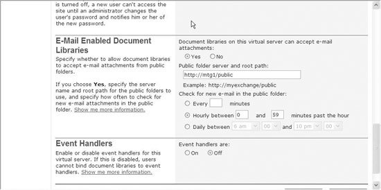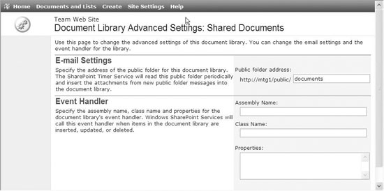 Теперь при пересылке сообщений электронной почты по адресу documents@acme.com Exchange помещает их в папку Documents. Затем SharePoint обнаруживает вложенные файлы и копирует их в папку Shared Documents. Тело сообщения не копируется в SharePoint; нельзя настроить SharePoint и на заполнение любых других полей, добавленных в библиотеку администратором. Интеграция общей папки с библиотекой документов охватывает только вложенные файлы. Дополнительные сведения по настройке изменений приведены в статье Microsoft «Configuring E-Mail-Enabled Document Libraries» (http://www.microsoft.com/resources/documentation/wss/2/all/adminguide/en-us/stse15.mspx?mfr=true).