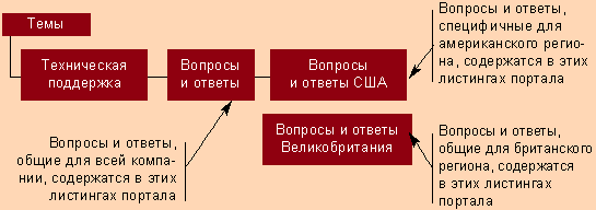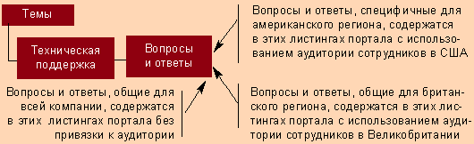 Чтобы уменьшить глубину навигации, можно использовать аудитории (audience — специальная группа, члены которой могут просматривать определенный контент, предназначенный для этой группы), листинги портала и объединенные листинги портала. Как это сделать, будет показано на примере области портала с простой структурой для управления набором типичных вопросов и ответов для региональных подразделений компании.