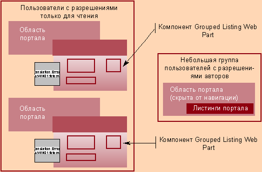 | Рисунок 2. Использование компонента Grouped Listing Web Part для управления контентом с разными разрешениями |