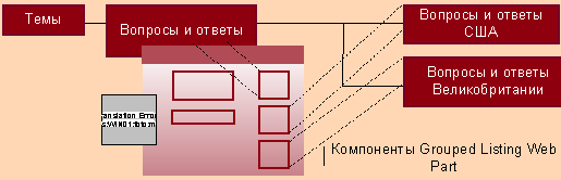 На внедрение решения, в котором аудитории используются таким образом, может быть наложен ряд ограничений, в зависимости от требований к авторству контента. Если требования компании позволяют объединить авторов ответов на вопросы в единую группу, каждый из членов которой имеет право изменять все ответы, этот метод вполне приемлем. Но если необходимо иметь отдельные группы авторов общих ответов, вторую группу для авторов американских ответов и третью группу для авторов британских ответов, то необходим иной подход. Один из способов — скрыть как область US FAQ, так и область UK FAQ из навигации по порталу и просто показать три компонента Grouped Listing Web Part в области FAQ (рис. 5).