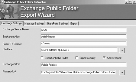 Теперь все готово для извлечения данных из общих папок Exchange. Программу Exchange Public Folder Extractor можно установить на любой клиентской машине с .NET Framework 1.1 и Outlook, настроенным для работы с объектами Collaboration Data Objects (CDO) 1.2.1. Учетная запись для запуска Extractor должна иметь разрешение Read в общих папках Exchange и разрешение Write в выходном каталоге. В данном примере используется интерактивный интерфейс, но Extractor можно запустить и из командной строки. После запуска Extractor необходимо заполнить все поля на вкладке Exchange Settings мастера Exchange Public Folder Export Wizard (экран 2). Администратор выбирает папку, с которой следует начать экспорт; можно обработать все дочерние папки или установить флажок Export only this folder, чтобы обработать только данную папку. Флажок Add Webpart указывает, будет ли целевой список содержать Web-модули, созданные на домашней странице SharePoint. Если этот флажок не установлен, то список SharePoint будет доступен только из панели Quick Launch Web-узла SharePoint.