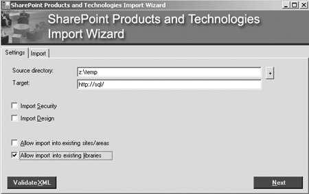 После окончания экспорта все готово к завершению миграции с помощью мастера SharePoint Products and Technologies Import Wizard. В отличие от Extractor, мастер Import Wizard должен быть установлен на Web-сервере SharePoint. Учетная запись, из которой запускается Import Wizard, должна иметь разрешение для обновления реестра этого сервера. Учетная запись также должна иметь разрешение для создания узлов и областей на узле SharePoint. Для мастера SharePoint Products and Technologies Import Wizard необходима инфраструктура .NET Framework 1.1.