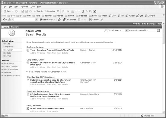 | Экран 2. Результаты поиска SharePoint Portal Server, сгруппированные по автору |