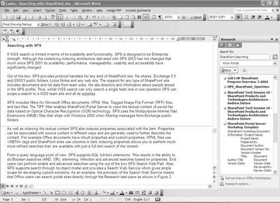 Об интеграции поискового механизма SharePoint Portal Server 2003 в панель задач Research комплекса Office 2003: http://weblogs.asp.net/wkriebel/archive/2004/04/27/121220.aspx.