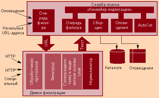 - Обработчики протоколов (protocol handlers). Они обращаются к данным через определенный протокол или из определенного хранилища. Типовые обработчики протоколов обеспечивают доступ к данным из общих каталогов, Web-узлов, общих папок, Lotus Notes и баз данных SQL Server. Обработчик протоколов использует URL-адреса, передаваемые ему сборщиком.