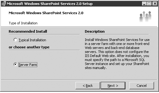- Если SharePoint размещен на одном компьютере с базой данных, можно выбрать режим Typical Installation; если сервер работает с другими серверами SharePoint или с отдельным сервером для базы данных (внутренняя база данных SQL), следует выбрать Server Farm (экран 2) и щелкнуть кнопку Next.