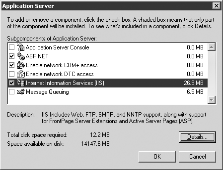 - Выберите ASP.NET (при этом автоматически открывается сетевой доступ COM+), затем Internet Information Services (IIS) и щелкните на кнопке Details (экран 1).