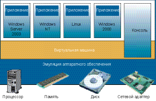 Пять основных продуктов в виртуальном серверном пространстве — VMware Server, Microsoft Virtual Server 2005 Release 2 (R2), Swsoft Virtuozzo for Windows, открытый продукт Xen 3.0 от XenSource и VМware ESX Server. Продукты VMware Server, Microsoft Virtual Server 2005 и Xen 3.0 являются бесплатными. Первые три продукта обладают одинаковыми возможностями. Продукт VMware Server, пришедший на смену линии VMware GSX Server, работает на Linux и Windows в качестве базовой системы. Появившаяся в результате приобретения Microsoft компании Connectix технология Virtual Server 2005 пришла на рынок позже, чем продукты VMware, и не обладает таким богатым набором функций. Однако Virtual Server 2005 R2 имеет лучшую производительность и поддержку важной функции Windows Server 2003 Clustering Services для реализации сценариев консолидации серверов, где базовый виртуальный сервер может быть единственным уязвимым звеном для нескольких VM. Virtuozzo for Windows и Xen 3.0 используются не так широко, как решения VMware или Microsof, но Virtuozzo — новичок для рынка Windows, а Xen, подобно большинству открытых разработок, имеет ориентацию на использование Linux в качестве базовой системы.