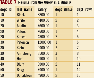 Функция RANK использует логическое группирование – это значит, что когда две или более строки в результирующем наборе имеют одинаковое значение в столбце, по которому производится упорядочение, эти строки будут иметь одинаковый ранг. Следующая строка будет иметь ранг равный единица плюс число строк, предшествовавших этой строке. Например, в таблице 6 имеется два сотрудника (Austin и Peters) из отдела 20 с одинаковой зарплатой. Эти два сотрудника имеют одинаковый ранг (1). Ранг другого сотрудника (Kimes) из этого отдела равен 3. Логическое группирование функции RANK приводит к тому, что числа, соответствующие рангам, идут не подряд, а с промежутками. Если вы не хотите отображать ранжированные строки с неиспользуемыми промежутками, то можете использовать функцию DENSE_RANK. Запрос в Листинге 6 показывает, как пользоваться этой функцией, а в таблице 7 показаны результаты применения запроса. Разницу между функциями DENSE_RANK и RANK можно видеть в строке с данными по сотруднику Kimes. В таблцице 7 в столбце dept_dense против фамилии Kimes стоит ранг 2 (а не 3, как в столбце dept_rank на Рисунке 6) и, таким образом, промежутков неиспользуемых чисел нет.