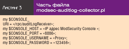 После настройки файла конфигурации в папку C:Apache2in необходимо перенести специальный сценарий на языке Perl, выполняющий работу по передаче событий на консоль. Этот сценарий можно загрузить, пройдя по ссылке http://www.securitylab.ru/software/293877.php. В самом файле сценария modsec-auditlog-collector.pl (листинг 3) необходимо ввести данные для подключения сенсора к консоли ModSecurity: