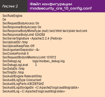 В папке C:Apache2conf ules находится конфигурационный файл modsecurity_crs_10_config.conf с базовыми настройками модуля ModSecurity. Настройки модуля достаточно подробно описываются в руководстве ModSecurity Reference Manual (http://modsecurity.org/documentation/index.html), поэтому мы не будем останавливаться на их описании.