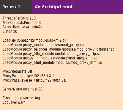 После установки Apache необходимо настроить его на работу в качестве обратного proxy-сервера. Для этого отредактируем файл конфигурации C:Apache2confhttpd.conf в соответствии с Листингом 1.