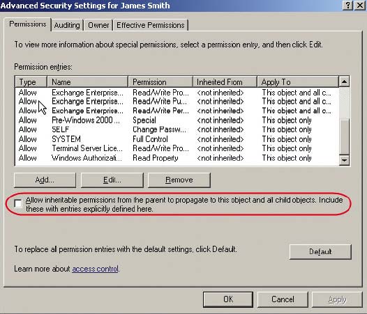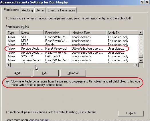 В настройках Дона Мерфи Джо видит, что группа Service Desk имеет разрешение на изменение паролей. А вот в настройках Джеймса Смита такого разрешения нет, что также свидетельствует о том, что цепочка наследования разрешений разорвана. Джо просит одного из администраторов AD изменить настройки безопасности Джеймса Смита так, чтобы они соответствовали настройкам Дона Мерфи. Джо отправляется на обед и, вернувшись, находит записку от администратора AD, в которой говорится, что настройки безопасности были изменены в соответствии с его пожеланиями. Джо вновь пытается изменить пароль Джеймся Смита и видит все то же сообщение об отказе в доступе. Что же произошло?
