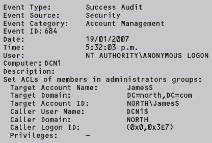 Самый популярный эффективный метод определения, какие учетные записи и группы были затронуты в ходе выполнения задачи AdminSDHolder, сводится к проверке записей аудита управления учетными записями с ID 684 в журнале регистрации событий безопасности на контроллере домена, эмулирующего главный контроллер домена. На экране 5 представлен пример подобной регистрационной записи. Отметим, кстати, такое обстоятельство: для того чтобы система могла регистрировать интересующие нас объекты, необходимо включить функцию аудита управления учетными записями. Дополнительные сведения о включении средств аудита AD можно найти в статье "Мониторинг изменений в Active Directory".