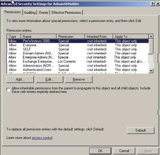 Вы можете изменить дескриптор безопасности, связанный с объектом AdminSDHolder, но я не советую этого делать. Имейте в виду, что после внесения изменений меняются все защищаемые пользователи и группы с новым дескриптором безопасности. Плохо спланированная конфигурация может превратить среду AD в мишень для всевозможных атак. К примеру, если вы предоставите членам группы Domain Users полную свободу действий в отношении объекта AdminSDHolder, это приведет к тому, что любой пользователь в домене будет иметь потенциальную возможность получить полномочия членов группы Domain Admins.