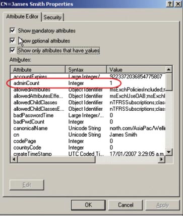 Наряду с этим задача AdminSDHolder меняет значение атрибута пользователя или группы adminCount. Если ранее его значение было