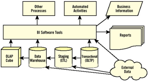 Рисунок 1 иллюстрирует связь между хранилищем данных и BI. Хранилище данных получает данные из разнообразных источников, включая процесс извлечения, преобразования и загрузки (ETL) данных в базу, оперативную обработку транзакций (OLTP) или загрузку непосредственно из внешних источников данных. Тогда в зависимости от данных, необходимых для проекта BI, можно составить многомерные OLAP-кубы (также опрашиваются многомерные базы данных) для хранилища данных. Например, банк может анализировать транзакции, переданные в асинхронном режиме для описания характера изменения, времени дня, очередности обработки информации, принимая во внимание, что розничная операция может выполнять анализ корзины в точке продажи - место продажи - транзакции. На вершине этой лежащей в основе структуры BI - слой программных инструментов со способностью подсоединяться к любому или ко всем источникам данных. Этот слой представляет собой многочисленные пакеты BI, которые можно использовать, чтобы анализировать данные, создавать отчет и искать информацию для деловых решений. Можно преобразовывать информацию в вычисляемых показателях или передавать в другие процессы для дополнительного анализа.