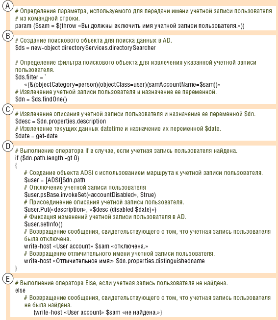 Код во фрагменте E отражает финальную часть сценария; это блок операторов Else. Оператор Else выполняется в том случае, когда условие If не выполняется. В рассматриваемом сценарии оператор Else с помощью команды Write-Host отображает сообщение о том, что искомая учетная запись пользователя не была обнаружена.
