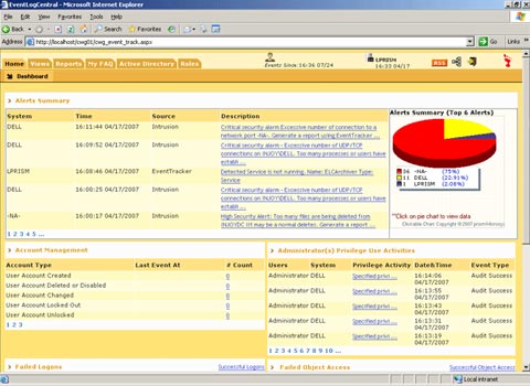 EventTracker от Prism Microsystems обеспечивает проверку журналов событий Windows, нескольких вариантов syslog и текстовых файлов регистрационных данных. В этом году на смену версии 5.6 должна прийти версия 6.0 с полной поддержкой каналов событий Vista. Еще один продукт - EventLogCentral - обеспечивает Web-доступ к отчетности и аналитике по данным, собираемым EventTracker. Имеются и другие компоненты, поддерживающие работоспособность сервера контроля и получение SNMP-трапов.