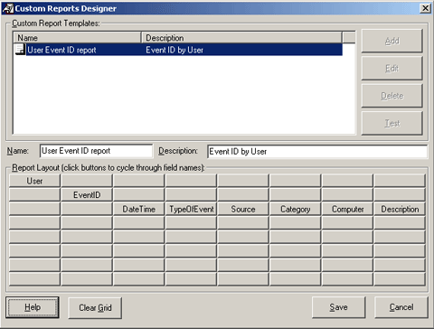 Далее наступила очередь Event Analyst. Как и раньше, установка прошла быстро, и в графическом интерфейсе Event Analyst мне удалось открыть и просмотреть события из таблиц базы данных, созданной мною ранее на основе файлов EVT. Запуск процесса формирования отчета осуществлялся в три этапа: открытие источника регистрационных данных, применение фильтра для ограничения контингента событий, включаемых в отчет, и составление отчета. Я выполнил построение довольно большого числа отчетов как по базам данных, так и по файлам EVT. Event Analyst допускает ввод только одного файла EVT, однако предусматривает удобную возможность выбора нескольких файлов EVT и их загрузки в файл базы данных Access, SQL Server или Oracle. Создание пользовательских отчетов в Event Analyst не составляет труда. Как видно на экране 2, Report Designer выдает сетку полей. Щелчок клавишей мыши в поле инициирует отображение следующего доступного поля данных. Единичное поле в одной из верхних строк определяет сортировку и образование групп. Последняя строка определяет поля, которые предполагается выводить в строке детальных данных.