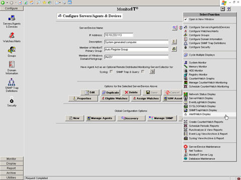Я пробовал работать со многими продуктами, использующими web-консоль управления, и отметил значительные различия в отношении их вида, ощущений при работе и общих полезных свойств. Некоторые консоли демонстрируют замедленную реакцию, а их конструкция не слишком эффективна для выполнения задания. Консоль MonitorIT обычно реагировала быстро. Исключение составляло лишь относительно медленное выполнение заданий по подготовке отчетов. Организация консоли позволяет легко отыскать нужную функцию. Как показано на экране 1, слева находится меню в стиле Outlook, а справа - раскрывающееся меню, помогающее выполнять задание в новом окне - удобная возможность.
