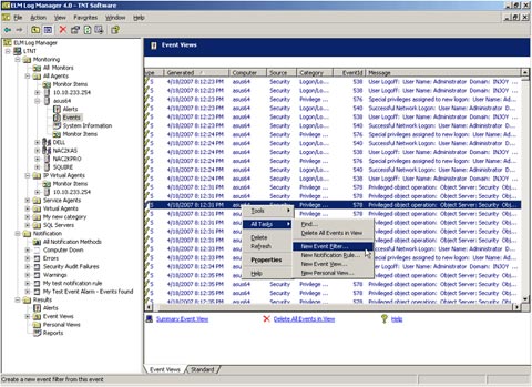 Установка Log Manager в системе Windows 2003 с установленным SQL Server 2005 Express Advanced Edition прошла без происшествий. Основные требования Log Manager - .NET Framework 1.1 и IIS 5.0 (или более поздняя версия) в конфигурации с ASP.NET. Я создал несколько новых категорий агентов, развернул агенты Service Agents на двух системах и виртуальные агенты Virtual Agents (для контроля без агента) - на двух других. Затем я создал несколько типов элементов контроля Monitor Items и обнаружил, что при просмотре оповещений и событий доступны контекстные меню, как показано на экране 6. Это облегчает создание фильтра событий для использования в другом месте. Представления ‘Events Views', ‘Personal Views' (те же ‘Events Views', но появляющиеся только для вашей регистрации при входе в систему) и ‘Notification Rules' используют один и тот же набор фильтров событий. Кроме того, я убедился в удобстве настройки правил уведомлений Notification Rules.