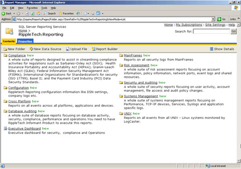 Мониторы LogCaster от RippleTech обеспечивают отчетность, проверку результатов деятельности в журналах регистрации Windows, вывод журналов syslog устройств и ведение журналов событий в виде текстовых файлов. Сохранение регистрируемых событий с изменяемой конфигурацией осуществляется в базе данных SQL Server, а для создания и хранения отчетов в различных форматах, включая PDF, HTML и CSV, используются службы SQL Server 2005 Reporting Services (SSRS). Контроль, осуществляемый LogCaster, не ограничивается лишь выводом данных в виде регистрационных журналов, а включает также возможность отслеживания счетчиков производительности Windows, запуска служб Windows и сетевых IP-служб, таких как электронная почта и Web-серверы, по корпоративной сети. Помимо журналов событий Windows, LogCaster отслеживает и составляет отчеты по данным syslog систем Linux/UNIX и сетевых устройств, а также по данным системы защиты данных в хост-машинах компании IBM - Resource Аccess Control Facility (RACF).