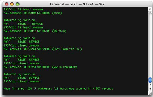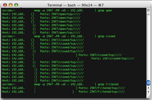 . При встрече с незнакомым компьютером такие программы, как Foundstone SuperScan 4.0 и сканер с открытым кодом Nmap, выдают не только информацию о том, что порт TCP 80, обычно работающий по протоколу HTTP, открыт, но и свойства или заголовок прослушивающего приложения. Мне нравится сканер Nmap, см. статью "Поиск опасных программ, скрытых в широко используемых портах", и не только из-за возможностей сканирования. Нравится, что Nmap запускается из командной строки, и что вывод результатов осуществляется в различных формах. Другими словами, этот сканер является прекрасным решением для всех видов централизованного сетевого аудита. Давайте посмотрим, как можно использовать сканер Nmap и его гибкий механизм вывода, чтобы быстро определить, установлено ли антивирусное программное обеспечение на компьютеры подсети.