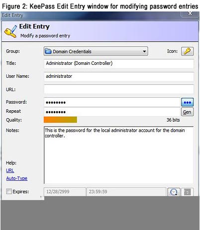 На экране 1 показан пользовательский интерфейс KeePass, весьма простой в освоении. На панели слева отображается иерархия групп паролей, которые можно создавать в соответствии с потребностями компании. К примеру, вы можете отделить пароли сервера финансовой службы от паролей службы поддержки или один домен от другого. Объединение паролей в группы облегчает визуальный поиск того или иного элемента, а также поиск заголовков, URL-адресов, примечаний и иных сведений. Достаточно впечатать имя пользователя, имя сайта или ключевое слово примечания - и можно приступать к проверке хранилища на наличие соответствующих записей. На правой панели отображаются члены группы паролей, а на нижней - подробные сведения о выделенном элементе (в данном случае - о записи пароля Administrator). Дважды щелкните на записи пароля, и на дисплее появится окно Edit Entry, показанное на экране 2. В этом окне вы сможете просматривать и изменять свойства выделенной записи. По умолчанию пароль невидим и остается защищенным; но вы можете, дважды щелкнув на пароле, скопировать его в буфер обмена и затем с легкостью вставить в поле паролей регистрационного окна или, нажав кнопку с надписью, напоминающей многоточие (...), отобразить пароль открытым текстом.