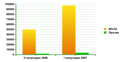 Однако доля не рассчитанных на Win32 вредоносных программ за первое полугодие 2007 года увеличилась с 3,18% до 3,42%. Процент пока небольшой, но темпы роста количества подобных приложений составили почти 111%, что превышает аналогичный показатель для Win32 (96%). Очевидно, что и в будущем доля вредоносных программ для Win32 будет снижаться, как за счет появления таких программ, рассчитанных на Win64, так и за счет роста популярности других операционных систем.