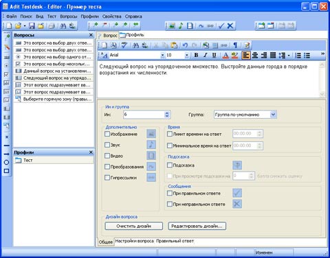 Новая версия позволяет создавать вопросы или тесты для профессиональных либо образовательных целей. Имеется возможность применения протокола SSL для взаимодействия клиента и сервера, а также управления сервером с помощью безопасного протокола SSH. Adit Testdesk - современная программа для тестирования с удобной навигацией, позволяющая составлять вопросы с максимальным разнообразием форматирования, присоединения изображения, аудио и видео файлов. Дизайн вопросов и самого теста полностью настраиваемый. В Adit Testdesk заложено 14 типов вопросов, которые можно объединять в группы, а также создавать полностью адаптивные тесты, задавая им различные настройки в зависимости от цели. Тесты и результаты тестирования можно экспортировать и импортировать в формат XML, а также импортировать тесты из текстовых форматов (RTF, TXT), в том числе созданные в аналогичных программах.