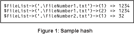 В ходе создания алгоритма было установлено, что можно использовать единственный хеш, в котором описание каждого пути будет храниться в виде ключа хеша (hash key). Значение, ассоциированное с ключом хеша, это подчиненный хеш (subhash), ключ которого указывает на анализируемый каталог (1 или 2), а значение ключа определяет размер файла. Результирующий хеш может выглядеть так, как показано на Рисунке 1. В рассматриваемом примере хеша файл с именем FileNumber1.txt существует в обоих каталогах (1 и 2), и оба файла имеют одинаковый размер (1234 байта). Однако файл FileNumber2.txt существует только в каталоге 1 и имеет размер 32 байта.