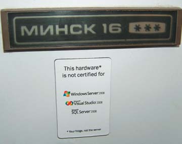 «Только при внимательном рассмотрении замечаешь надпись 'Your fridge, not the server' т. е.: 'Ваш холодильник, а не сервер'. Долго искал достаточно древний холодильник, к которому это можно было бы прилепить. Результат перед вами. Весьма любопытны отклики коллег, которым даришь подобные штучки. В зависимости от отношения к Microsoft, можно получить совершенно разные комментарии, но практически всегда веселые: 'даешь Server Core в каждый холодильник и кофеварку', 'прилеплю на свою Cisco, пусть знает, что ее ждет, если будет плохо работать', 'дайте две, наклею на Linux-сервер, чтобы, не дай бог, Windows не завелся'. Видимо, есть великая правда во фразе: 'Смейся, и весь мир будет смеяться с тобой'.