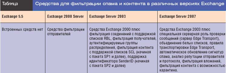 Еще одна причина того, что Exchange не был примером удачной реализации служб проверки сообщений на базе DMZ, состоит в том, что на фоне служб, реализованных в таких специализированных решениях, как Symantec Mail Security, Tumbleweed MailGate или даже бесплатно предоставляемая служба Postfix на базе UNIX, службы проверки сообщений предшествующих версий Exchange имели весьма ограниченный набор возможностей. Список средств фильтрации спама и контента, реализованных в различных версиях Exchange, приводится в таблице. Однако в Exchange 2007 имеются важные дополнительные средства для фильтрации спама и контента, которые позволяют этой версии конкурировать с завоевавшими хорошую репутацию средствами проверки сообщений от независимых поставщиков.