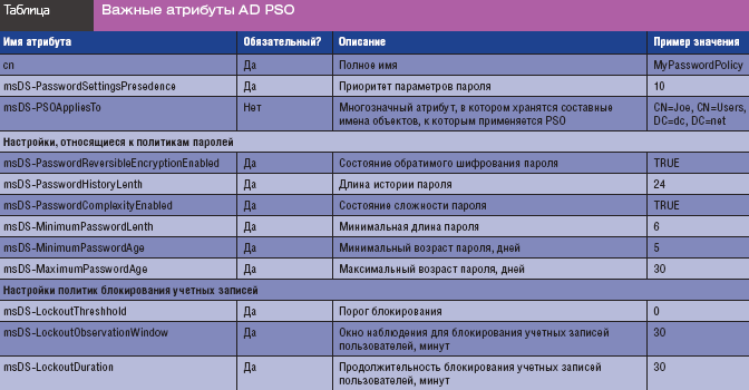В таблице приведена сводка атрибутов, связанных с объектами PSO в Windows Server 2008. Обратите внимание, что в объекте PSO могут храниться не только настройки политики паролей, но и настройки политики блокирования учетных записей. Помните, что Server 2008 поддерживает детализированные как политики паролей, так и блокирования учетных записей. Два важных атрибута PSO — msDS-PSOAppliesTo и msDS-PasswordSettingsPrecedence.