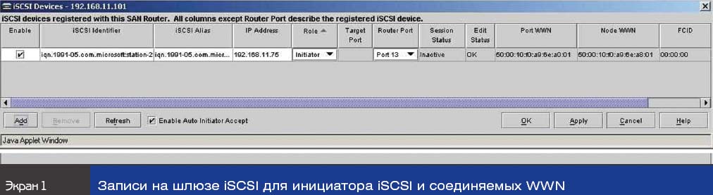 Регистрация инициаторов iSCSI осуществляется по идентификаторам iSCSI, а регистрация ресурсов SAN — по именам WWN и по идентификаторам Fibre Channel (FCID) на шлюзе iSCSI. Чтобы должным образом настроить шлюз iSCSI, указанные выше идентификаторы необходимо определить заранее. На экране 1 утилита настройки для шлюза iSCSI (в нашем примере это Brocade M2640) показывает инициатор iSCSI, определяемый идентификатором и псевдонимом iSCSI, IP-адрес и представленные через посредника имена WWN.