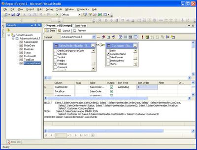 Ради простоты при подготовке образца отчета была просто выбрана таблица SaleOrderHeader из базы данных AdventureWorksLT. Выбор целой таблицы -- удобный способ начать работу. Однако в ней содержится гораздо больше данных, чем нужно; это противоречит основному принципу проектирования баз данных: всегда извлекать лишь нужные данные. Чтобы сократить данные в отчете, следует запустить BIDS из меню Start, All Programs, Microsoft SQL Server 2005, SQL Server Business Intelligence Development Studio. Откройте сохраненный проект отчета с выбранным по умолчанию именем Report Project1.