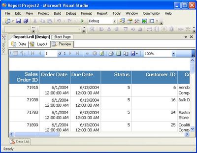 Откройте проект Reporting Services, щелкнув на кнопке Start, а затем выберите All Programs, Microsoft SQL Server 2005, SQL Server Business Intelligence Studio. Укажите проект отчета из списка Recent Projects или воспользуйтесь меню File, Open, Project/Solution. В предшествующих статьях было показано, как выбрать нужные данные на вкладке Data и отформатировать отчет на вкладке Layout. Теперь щелкните на вкладке Preview, чтобы просмотреть образец отчета. Его вид показан на рисунке.