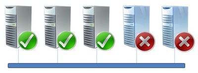 * Node Majority (большинство узлов). - свидетель или диск-свидетель отсутствуют, и голоса назначаются только узлам. Для кворума должны быть доступны более 50 процентов узлов. Режим Node Majority наиболее удобен при нечетном числе узлов. Режим Node Majority рекомендуется, если число узлов нечетное, и имеется многосайтовый кластер, кластер без общего хранилища данных или одноузловой кластер. На рисунке ниже показан пример кворума Node-Majority.