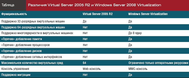Таблица. Различия Virtual Server 2005 R2 и Windows Server 2008 Virtualization