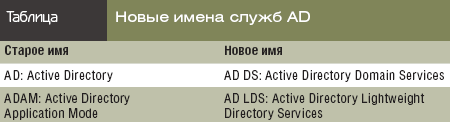 Потребуется время, чтобы привыкнуть к одному небольшому, но важному изменению Active Directory (AD) в Windows Server 2008. Чтобы лучше различать версии AD, в Windows Server 2008 введены новые имена для основных служб. Эти имена приведены в таблице.