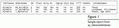 Хранимая процедура sp_GenerateIndexes также создает очень полезный отчет, который детализирует различные свойства каждого индекса (кластеризован ли индекс, порядок сортировки и фактор заполнения). На рисунке 1 показан пример отчета отредактированного ради экономии места. Я пробовал использовать короткие названия полей, чтобы можно было включать столько информации, сколько возможно в отчете. Приведу краткое описание каждого поля: