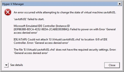 Если виртуальный жесткий диск расположен на сервере файлов, необходимо подключаться через путь UNC (использовать присоединенные диски или точку подключения нельзя), а учетная запись компьютера Hyper-V (domaincomputername$) должна иметь разрешения полного доступа к VHD-файлу и находиться на сетевом ресурсе, содержащем VHD.