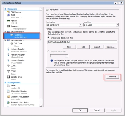 2. В меню Hardware выберите виртуальный жесткий диск, который вызвал неполадку и нажмите кнопку Remove (см. экран ниже).
