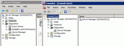 В диспетчере Server Manager не будут показаны оснастки, для которых сняты флажки. На следующем экране видно, что перестали отображаться две оснастки (Event Viewer и Reliability and Performance Monitor Extension), снятые на предыдущем экране.