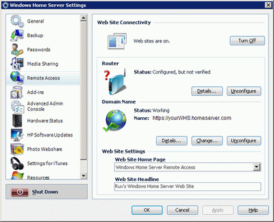 На Рис. 1 показана простая страница настройки удаленного доступа. По умолчанию Web-узел на системе WHS отключен, поэтому первый шаг -- активизировать службу нажатием кнопки "Turn On/Turn Off". Если маршрутизатор или брандмауэр совместим со спецификацией UPnP (как большинство новых моделей), просто запустите установку щелчком мыши, и WHS проверит, поддерживает ли маршрутизатор UPnP, работает ли Web-узел, активизирован ли удаленный доступ и доступен ли сервер через Internet.