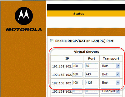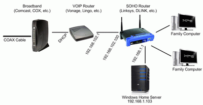 Последняя проблема, которая может возникнуть перед обладателями Vonage или другой службы Voice-over-IP (VoIP) для телефонных переговоров через Internet-соединение: как обратиться к системе WHS из Internet, если вызов должен пройти через устройство VoIP? В этом случае нужно выполнить ручную настройку, поскольку система WHS не сделает этого автоматически. На Рис. 3 показан процесс ручной настройки широко распространенного маршрутизатора Motorola VT1000 VoIP. На Рис. 4 дана общая картина и видно подключение каждого устройства, а также использованные IP-адреса.