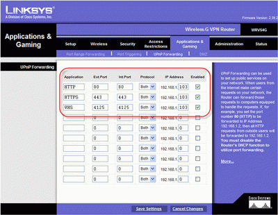 Ext. Port и Int. Port -- порты TCP/IP, которые нужно задействовать. Если рассматривать адрес TCP/IP как номер телефона, то порты - это просто телефонные расширения, указывающие конкретные службы, которые может предоставить компьютер. Порт 80 -- "http" или "simple web traffic". Третий порт, 4125 -- специальный порт "remote web workplace" (удаленное рабочее место Web) компании Microsoft, который обеспечивает специальный доступ к системе WHS и дистанционное управление домашним компьютером.